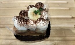 バナナチョコクリームの上にバナナと生クリームをたっぷりのせたタルトです
